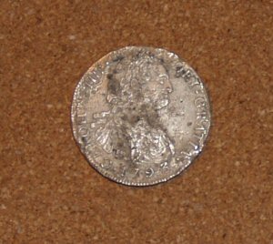| Silver Reale 8 coin found on a Caribbean sunken wreck site. The coin minted in Mexico shows the date 1793 with King Charles IV and the coat of arms. |